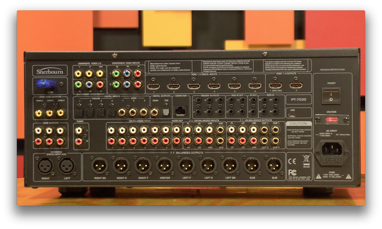 The Sherbourn PT-7030 does just about everything you need it to, and nothing you don't. It's a product that seems to have the guts and bells & whistles that matter—particularly to the custom installer. Take the six HDMI 1.4a inputs and two HDMI 1.4a outputs—that's going to get everything you need into the system and also allow you to connect any ARC-enabled device as well to one of the outputs. Twin Cirrus 32-bit dual-core DSP processors provide the expected 192 kHz audio performance, and video processing is aptly handled by the familiar and adept DCDi chipset.