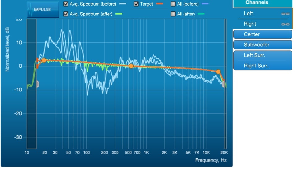 Dirac DLCT measures your listening area with nine individual measurement points distributed in your listening area. Calibrations are applied common to all positions to avoid applying correction that optimizes only one point in space at the expense of others. DLCT displays graphs of the room measurements, target curve, and the predicted results. I began by using Emotiva standard target curve (the LE version). After completing the calibration Dirac showed predicted results that matched the target curve.