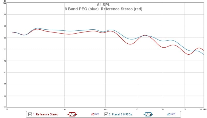 Since I have been in the purist camp for many years, I have not used PEQ in my system. With the REW mic in place from my Dirac measurements, it was a simple process to create filters to flatten out the bass response. I set about doing this by measuring with REW, selecting a peak or valley center frequency, applying a gain or cut to level it out, and then using the width parameter to narrow or expand the band to match the REW measurement. This was a very simple and straight-forward process. The results are shown below apply an 8 non-overlapping filters to level out the bass response below 80 Hz.