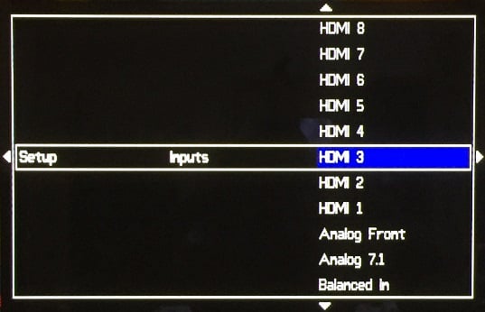 audio and video selection to be made independently and the user may assign the remote/front panel button that activates it. I configured Input button 7 for Balanced Input and Input 6 for the USB DAC. The menu system is simple text and boxes, you don’t get the 3D graphics of rooms and speakers, but it is versatile, full featured, and works well.