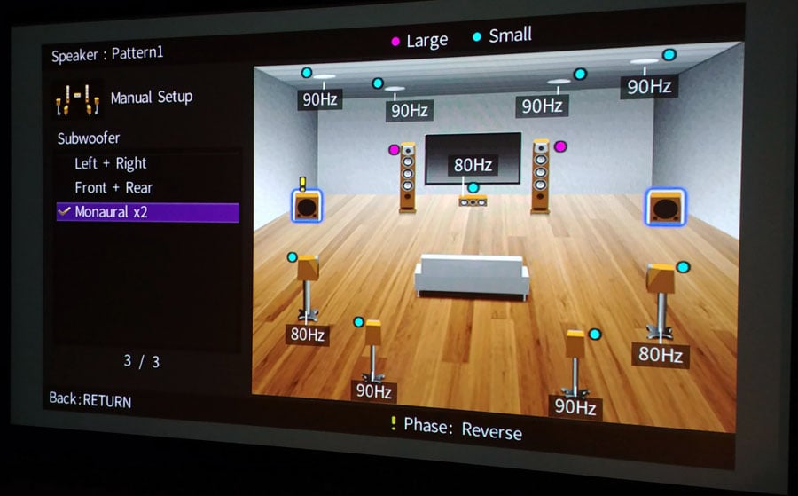 For those serious about getting good bass, the CX-A5100 sports dual configurable subwoofer outputs which allows the user to adjust level and delay, and manual PEQ independently. We recommend using either the stereo "Left + Right" or "Monaural x2" options for the subwoofer configuration since the "Front+Rear" only sends LFE to the rear output while sending bass from other bass managed channels to the front subwoofer. This is NOT the best option for taking advantage of modal averaging since both subs won't be getting the ALL of the same bass signals, which would really hinder the overall performance as a result.