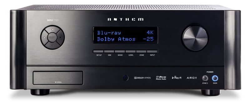 The flagship receiver MRX 1120 includes all of the benefits of the MRX 720 plus 11.1 channels of processing and a rare 11 channels of amplification. The internal amplification can be configured for up to 7.1.4 speakers or 5.1.4 plus Zone 2. Anthem says that all amplification takes place through a toroidal power supply.