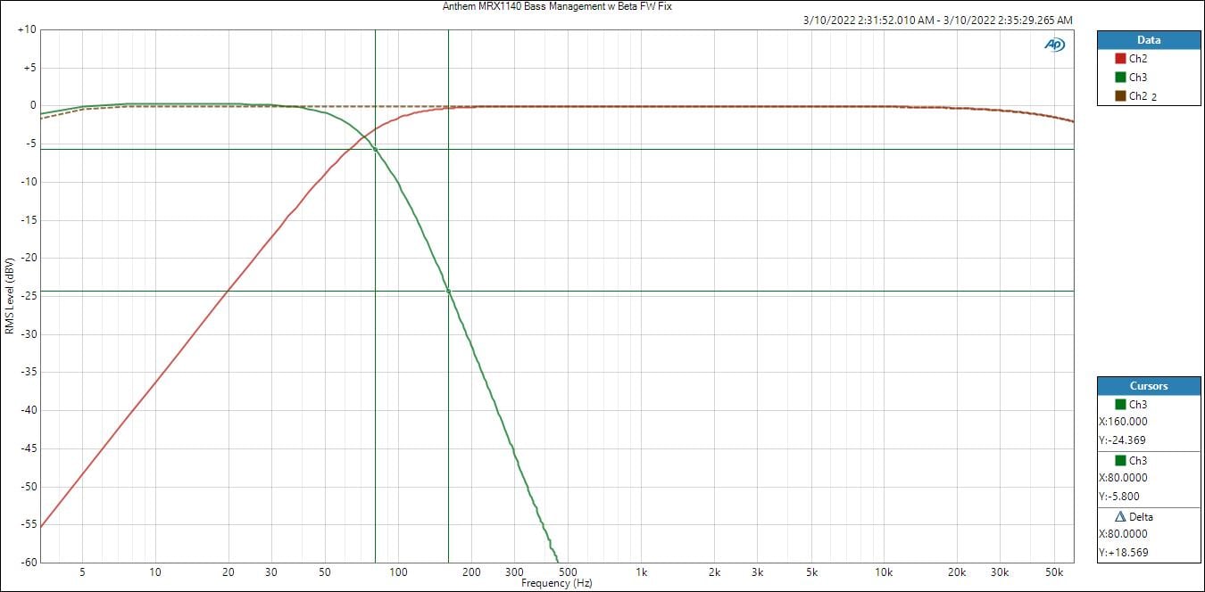 The Anthem MRX740/1140 bass management engaged with a crossover point of 80Hz resulted in the expected 12dB/oct HPF response for bass managed speakers but only 12dB/oct instead of 24dB/oct LPF on the sub out that we’ve come to expect in today’s modern AVRs. I asked Anthem if they could look at offering a steeper 24dB/oct crossover point and within a couple of weeks of my request, they sent me beta firmware to test.