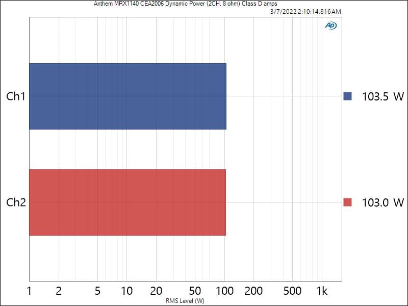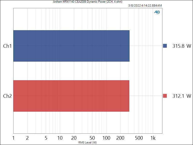 The Anthem MRX1140 produced 187 watts/ch with 2CH driven, 8-ohms and 312 watts/ch with 2CH driven, 4-ohms at 1% THD+N for our CEA-2006 dynamic burst tests. These results demonstrate good headroom on these amps to handle music/movie transients.