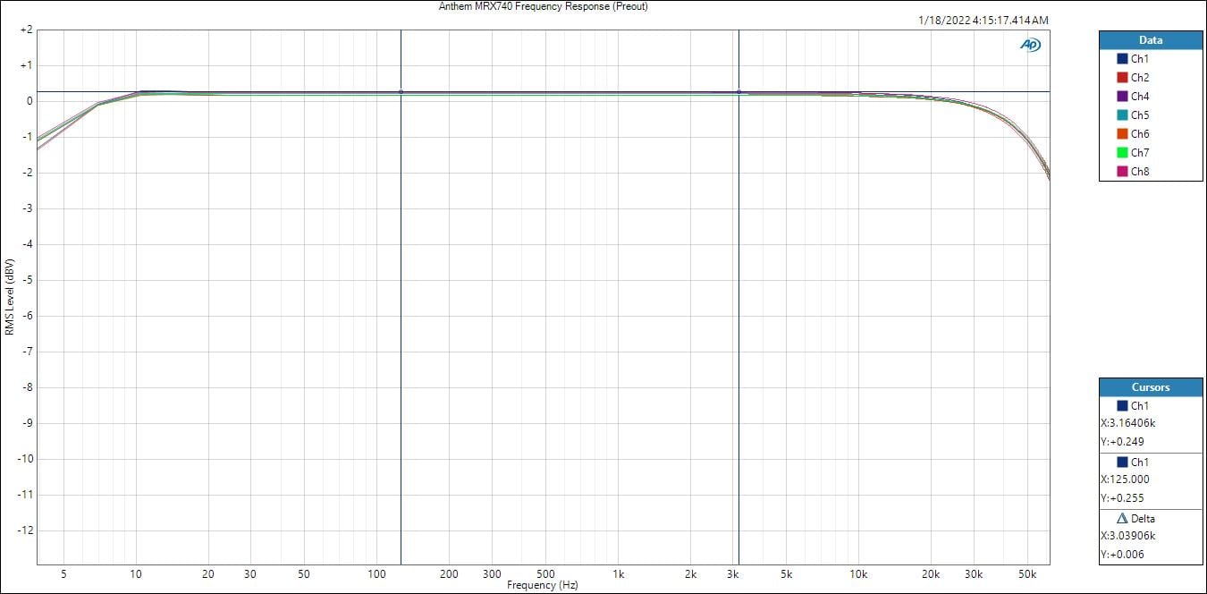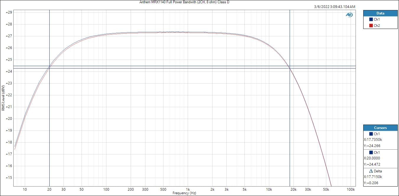 I was a bit puzzled by the bandwidth limited frequency response of the Class D amp section in these Anthem receivers despite setting them for full range for these tests. I found the -3dB pt to be 20Hz and 17kHz, respectively. This should still be fine if used as height channel duty.