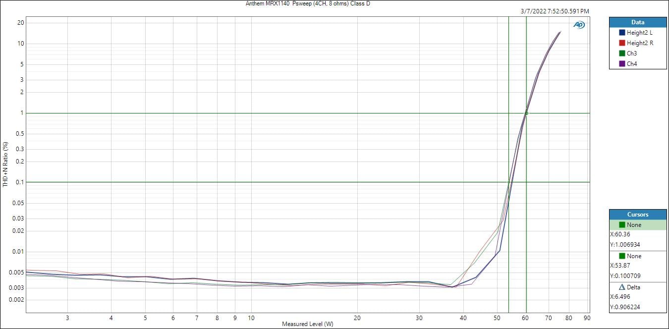 The Class D amp section of the Anthem AV receivers shows some good dynamic headroom (+2.2dB) on the 60 watts/ch rated amplifiers.