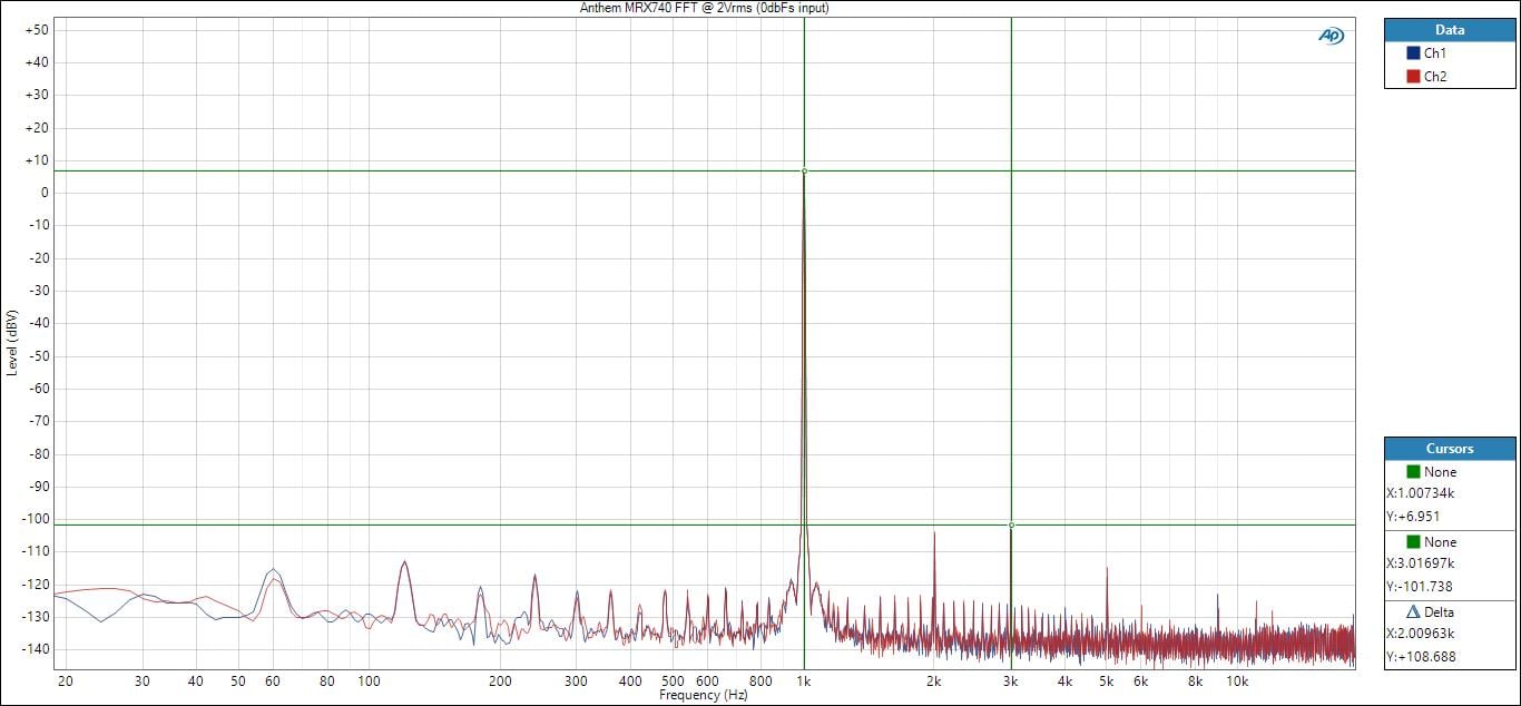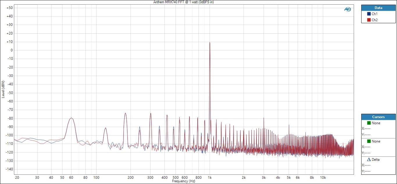 I do FFTs at 1 watt to show how clean an amp will be at low power levels where problems could be more audible and not masked by a louder SPL. The MRX740 shows some higher power supply harmonics (-72dB) compared to the MRX1140 (-88dB). This is inaudible but academic and perhaps shows favor to why Anthem is using a torodial power supply in the MRX1140 with an E-Core in the MRX740. The 3rd order harmonic is 90dB below the 1kHz fundamental which is a good measurement.