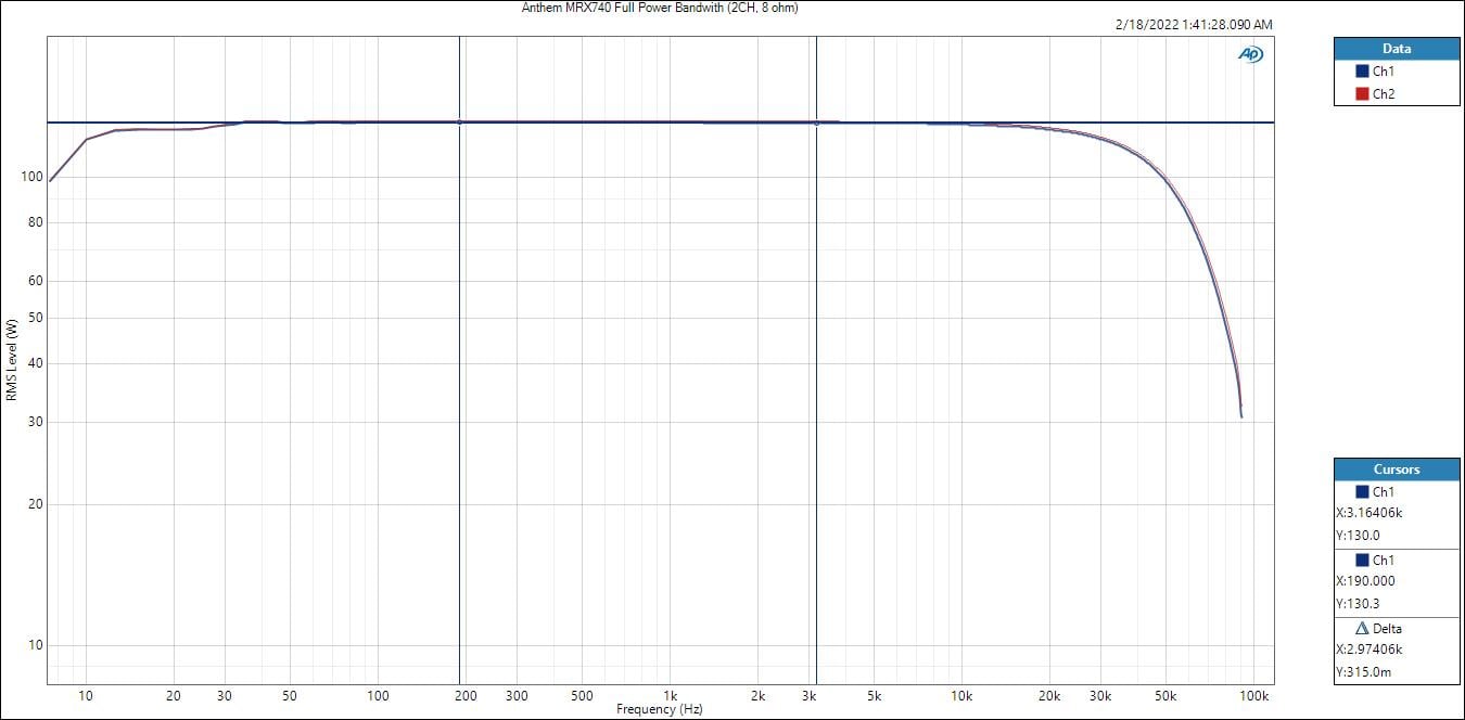 I tested the Class D amp sections separately from the linear AB amps for the Anthem receivers. The power output of the MRX740 and 1140 amplifier sections are rated identically and I found this to be the case for the Class D sections with slight variances for the AB amp sections as noted in this report and associated data table. In efforts of simplicity, I only show graphical differences with the remaining data in the power table below.