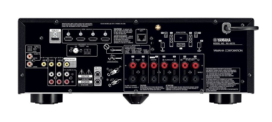 The AVENTAGE RX-A870 steps up to 100W per channel and eight HDMI inputs and dual HDMI/HDCP 2.2 outputs. Installers can add a secondary room setup with HDMI Zone B with Zone 2 pre out/variable capability. Like the RX-A860 we've recently reviewed, the RX-A870 also has 7.2CH preamp outputs for those wanting to add external amplification to increase power or drive power hungry speakers with more authority. We are uncertain if Yamaha improved these analog outputs to offer increased voltage drive. So, we caution the user to select external amplification with at least 29dB voltage gain to ensure the RX-A870 can drive it to full power without it clipping.