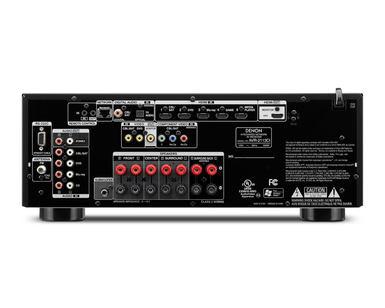 The AVR-2113CI is a 7.1 receiver sporting 95 watts per channel. It weighs in at just under 21 pounds. There are six (one on the front) HDMI 1.4a connections (supports Audio Return Channel and 3D), one component video input, and three composite inputs (one on the front) and one output. There is a single input of each digital audio type (coaxial and optical) and a handful of analogue audio inputs. There are seven speaker-level connections with the surround back channels assignable to Zone 2 (RCA outputs also available). RS-232 support is on board (for you custom installers) and there is a single subwoofer output.