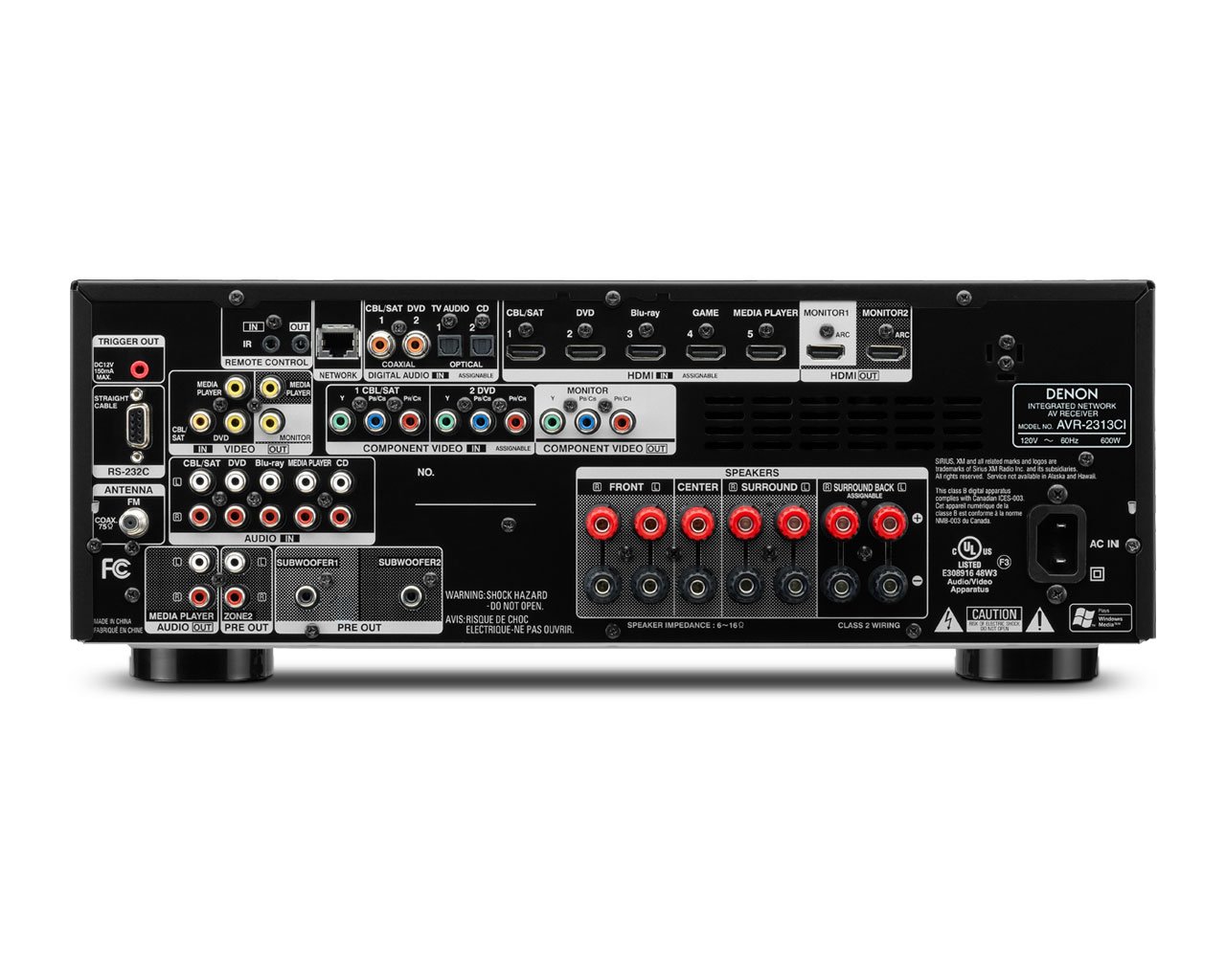The AVR-2313 adds $250 to the price of the AVR-2113 bringing the MSRP to $899.99. The AVR-2313 is a 105 watt per channel (seven channels) receiver with dual subwoofer outputs. It clocks in at 24 pounds. It builds on the base of the AVR-2113 but adds a a lot of additional connections.