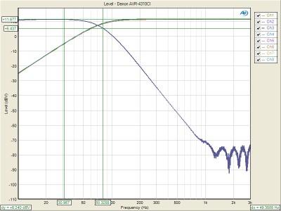 As with virtually all modern Denon A/V receivers, the bass management facilities on the AVR-4310CI was top notch. We measured a perfect THX type response with the crossovers set to 80Hz where the subwoofer was at -6dB at 80Hz exhibiting a 24 dB/oct rolloff while the satellites were -3dB down at 80Hz with a 12 dB/oct rolloff as can be seen in the measurement below (Figure 7).