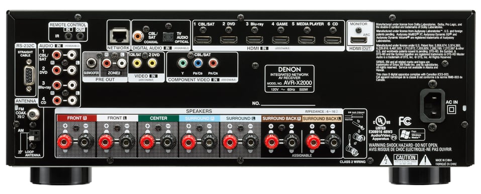 Custom installers will be happy to see an RS-232 port on the back for control as well as an IR in and out (there was only an IR in on the X1000). AMX, Control4, Crestron, RTI, Savant, URC third party control support are standard with the AVR-X2000.