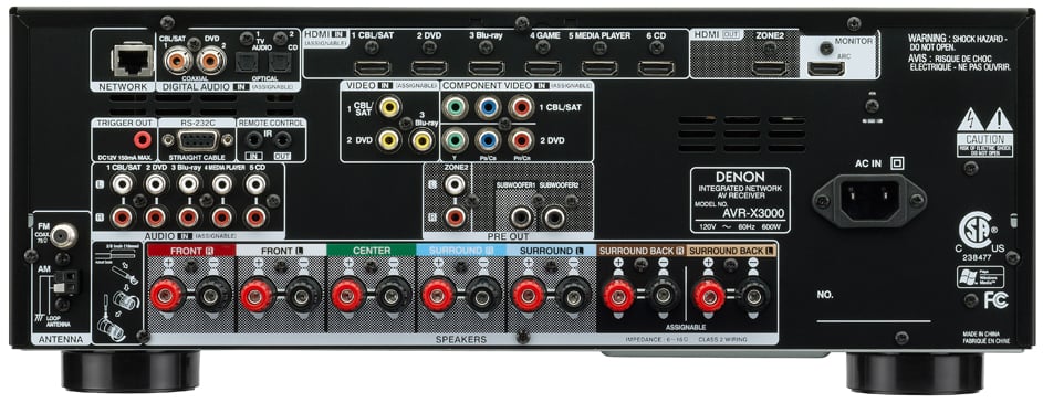 There are quite a few more non-HDMI connections on the back of the AVR-X3000 than it's little brother, the AVR-X2000. You get two component video, three composite video, two optical audio, two coaxial audio, and five analog audio inputs. For the first time in the IN-Command line we find a trigger output for use with an external amplifier. There is also an additional subwoofer output, making the AVR-X3000 a 7.2 receiver.