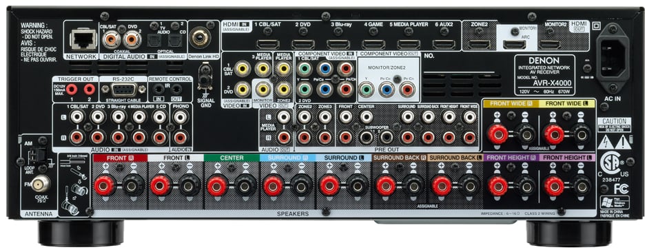 The back of the AVR-X4000 looks a lot more like the receivers of old. While there are still seven HDMI inputs, there are now three outputs. The HDMI connections are, like the X3000, ARC, 3D, and 4K compatible. One of the three outputs is labeled Zone 2 but now there are two monitor outputs. This is helpful if you have multiple screens showing the same content or if you have a main and a secondary source of video (some people use a projector for night viewing and a flat panel for daytime viewing). Outputs for composite and component video have made a reappearance. The composite is most likely just a backup but both composite and component can be sent to Zone 2 for a full second zone.