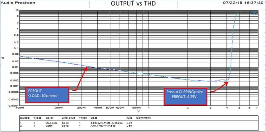 With the AVR-X3600H configured to reroute the main front L/R internal amplifiers, the preamp is physically disconnected from the power amp. This allows the preamp stage full capability of delivering up to 4Vrms unclipped when connected to external amplification as can be seen in the following output vs distortion plot courtesy of Sound United Engineering.