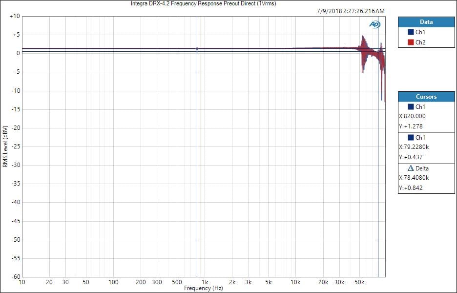 Direct mode produced a flat frequency response within the audio band 20Hz-20kHz with a CH-CH deviation of +-0.13dB. The -3dB point out was out to about 78kHz and I noticed some peculiar ringing above 50Khz that even the folks at Integra were puzzled by.