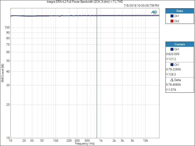Using our Audio Precision APx585 8-channel HDMI analyzer, we conducted a full barrage of multi-channel amplifier tests on Integra DRX-4.3 per our Amplifier Measurement Protocol. We tested power using three methods all of which were taken at < 0.1% THD + N: