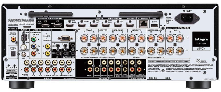 Integra DRX-4.3 Backpanel - note wireless inclusion replaces HDBaseT
