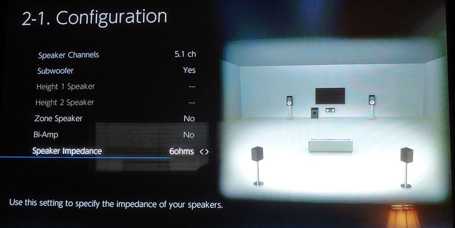 Like most AV receivers these days, two of the nine internal amplifiers can be reconfigured for bi-amping the front channels if your speakers are bi-amp capable. I don't recommend using this feature since the power supply isn't big enough for your speakers to really benefit from it, especially if you're running the internal amps to power the other channels simultaneously. Integra included the dreaded impedance switch in the configuration menu and we highly recommend leaving it on the default 6-ohm setting regardless of actual speaker impedance. Setting it the 4-ohm setting will significantly drop the available output power of the receiver, as you will later see in our test report. It's only there for one purpose: to clip the amp sooner so it will generate less heat by being tested at a lower power level for 4-ohm UL certification purposes. This receiver has two giant fans and lots of nanny controls already built-in aside from the impedance switch. Don't further choke the power by enabling the low setting of this "feature."