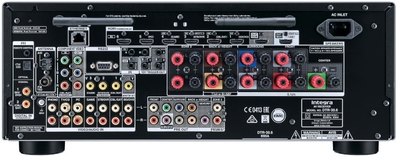 The DTR-30.6 ($1000) is rated at 95 watts per channel and weighs in at 23 pounds. It has seven HDMI inputs and two outputs. 4k upscaling is performed by Marvell's Qdeo chipset. There are dual wireless antennas for WiFi and Bluetooth connectivity. While there are no 7.1 analog inputs, the DTR-30.6 has full 7.2 pre-outs for adding an external amplifier and a phono input for vinyl lovers. The pre-outs for the surround backs are also labeled as "Height" indicating that you'll need to choose one or the other. According to the manual, you can select the type and placement of Atmos speakers but you can't have the internal amps power the surround backs and an external amp power the Atmos speakers. It is one or the other. The DTR-30.6 supports up to two zones of audio (either internally powered or with an external amplifier).