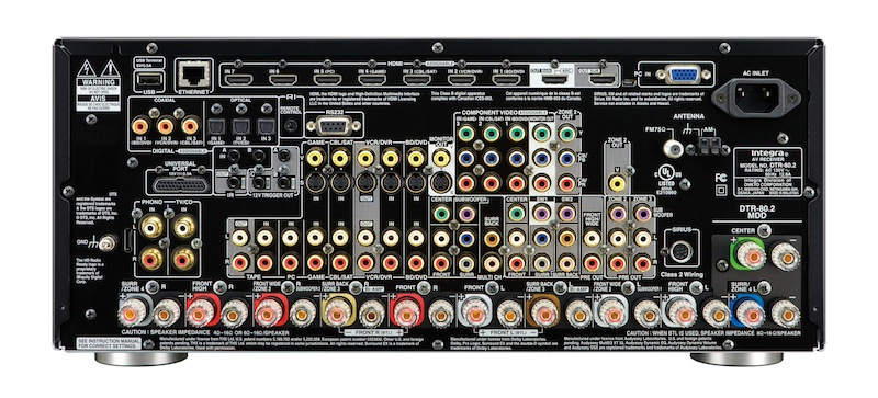 It might take a while to figure out what is missing from the new THX Ultra2 Plus certified Integra DTR-80.2. The laundry list of features is as long as your arm (single spaced). We can start with the basics - 145 Watts per channel at 8 ohms, 20 Hz–20 kHz, 0.05%, two channels driven. The DTR-80.2 has an advanced, audiophile grade power supply with a massive, high-current, low-noise, toroidal power transformer that is dedicated exclusively to audio amplification. The receiver also has two other separate transformers and power supplies, one dedicated to the audio circuitry and the other to the video circuits. The back of the unit sports 11 pairs of binding posts with 9 channels of amplification. The Integra DTR-80.2 supports four zones of audio. This allows you to to connect up multiple speakers in different configurations and switch between them without having to manually switch speaker wires. There are 8 HDMI 1.4a inputs (one on the front panel) that support all the current 3D formats, Audio Return Channel, and HDMI Thru and two simultaneously active capable outputs.