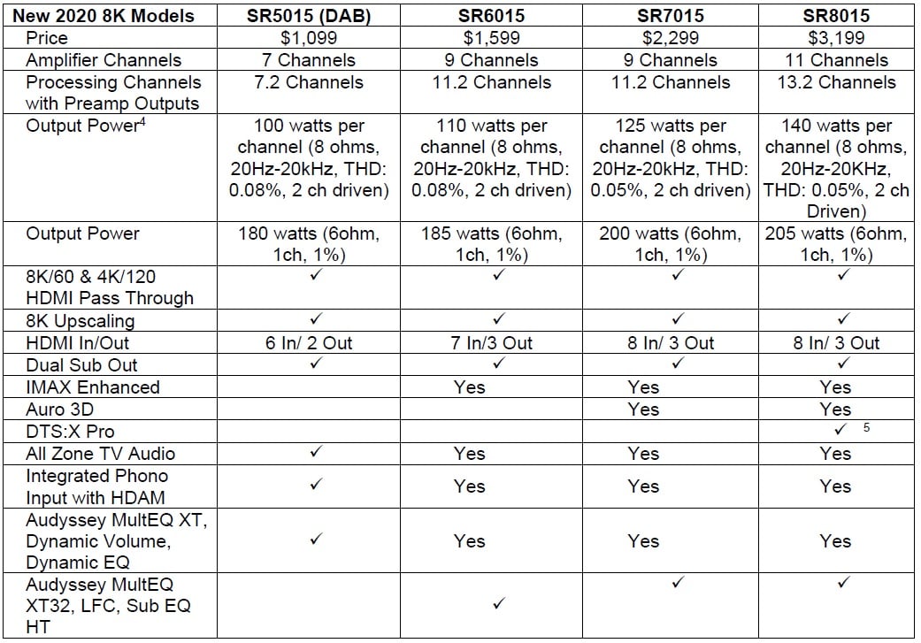 For advanced multi-channel home theater applications, the flagship SR8015 supports DTS:X Pro, which will allow you to enjoy up to 13 channels of DTS:X decoding with speaker configurations such as 7.2.6 or 9.2.4. In addition, the SR8015 can decode the latest in IMAX Enhanced films in 7.2.6 or 9.2.4 speaker configurations thanks to newly adopted 13.2 channel processing capabilities with external amplification. The DTS:X Pro feature will be delivered via firmware update later this year. The 2020 SR-Series feature several other 3D audio formats, including Dolby Atmos, Dolby Atmos Height Virtualization Technology, DTS:X, DTS Virtual:X, IMAX Enhanced and Auro-3D out-of-box.