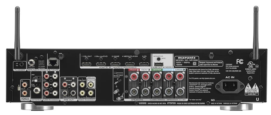 The NR1508 is a simpler receiver, designed for those who don’t want all the features of the NR1608. It has a 5.2-channel design, with five discrete 50W channels (8 ohms, 20 Hz~20 kHz, 0.08% THD), it’s compatible with all the same 4K ultra video formats on its six HDMI inputs, and has decoding for Dolby True HD and DTS-HD for conventional surround setups. It does NOT have coding for Dolby Atmos or DTS:X and can NOT upconvert video to 4K video. The same Audyssey MultEQ set-up and functionality is featured, and the NR1508 can also be controlled using the Marantz 2016 AVR app.