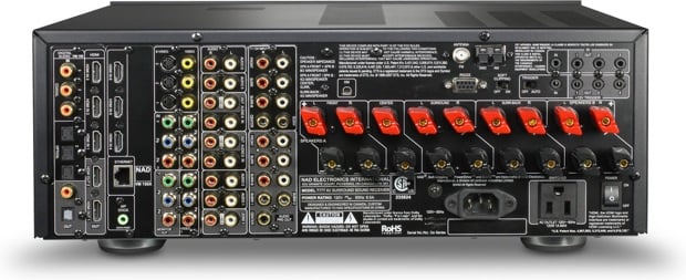 Taking a look at the back, we see quite a bit of crowding. The HDMI inputs are stacked which, while technically not a problem, may make hooking up new components a pain. There are three each optical and coaxial digital audio inputs. There are 7.1 channel analogue inputs and 7.2 channel outputs. NAD is one of the few companies still supporting s-video inputs as well as composite video. Three component video inputs and one output tare included and the the T 787 will upconvert your analogue video sources to HDMI. The Ethernet port is not used for streaming content (NAD would prefer you buy their C 446 for that) but, instead, is used for IP control for custom installs. There are no USB ports, no phono input (odd omission considering the non-web-connected crowd likely to be interested in this receiver), no HD radio tuner, support for any of the height/width channels. Both the T 787 and T 777 sport Audyssey's MultEQ which should make setting up and calibrating your speakers much easier.