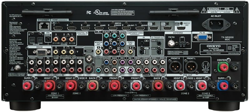 Capping the range at $2,399, the Onkyo TX-NR3030 boasts 11 channels of amplification as well as upgraded DACs over the TX-NR1030….and not much else. Yes, technically there’s another 12V trigger output for Zone 3, and a composite video output for Zone 2 (just in case you have a 20 year old TV that doesn’t support HDMI…), but we’re not convinced that those are big reasons to spend an extra $700 on an A/V receiver. Given that price premium, we’d just assume purchase the TX-NR1030 and spend a few bucks on an external amp like the Emotiva XPA-3. This way, you can still appreciate a 7.x.4 Atmos experience, not to mention get a serious boost in power for the front three channels where its needed most.