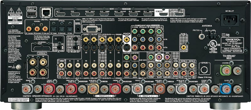 So, what does 9 channels of amplification give you? Lots of flexibility. You can have a full 7.2 system with two channels for a Zone 2 or distributed audio. You can even run all 9 channels in one theater when employing Audyssey's DSX or Dolby Pro Logic IIz height channel processing. Since the subwoofers are independent (and not mono as we've seen in the past), they can be configured for left and right if you want. You could even run a 5.1 system with a zone 2 AND the mains bi-amped. With the NR5007, you can use the two channels for an additional pair of main speakers in a dedicated 2-channel room (or in the same room if you like to A/B speakers).