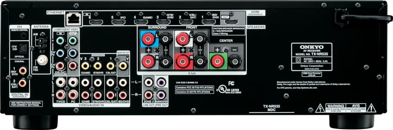 The TX-NR535 has two coaxial and one optical digital audio input as well as six RCA stereo analog audio inputs on the back plus one on the front. The speaker connectors are five-way binding posts, and there is a line out for Zone 2. Dual subwoofer outputs are available, and there is a wired Ethernet connection for connecting to your home network.