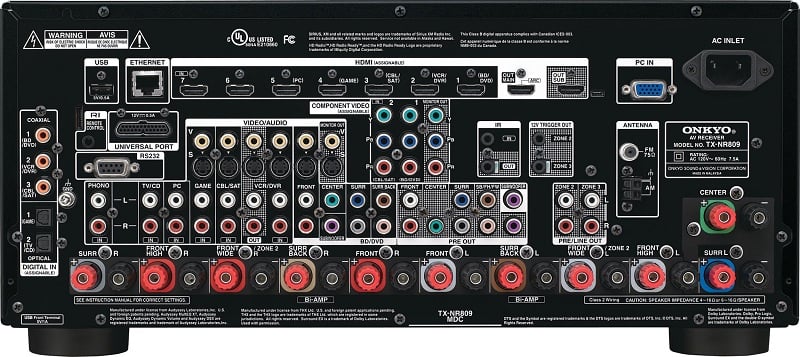 All the features in the world aren't worth much if you can't connect all your gear. That's not going to be a problem with the Onkyo TX-NR809. Sporting seven HDMI inputs on the back, one on the front all supporting 3D and Audio Return Channel, and dual HDMI outputs, all you high def needs are covered. If you have legacy gear, you have two component, and a slew of composite and s-video inputs. For those looking for seven channel analogue RCA inputs, the TX-NR809 has you covered as well as 7.2 channel outputs for integrating external amplifications and two subs. There is even a Phono input for those truly old school. If you have multiple zones the TX-NR809 supports audio to three zones with line outs can can assign the surround back channels to power a second zone. There are 11 pairs of binding posts on the back of the receiver so that you can set up different configurations without having to manually switch wires.