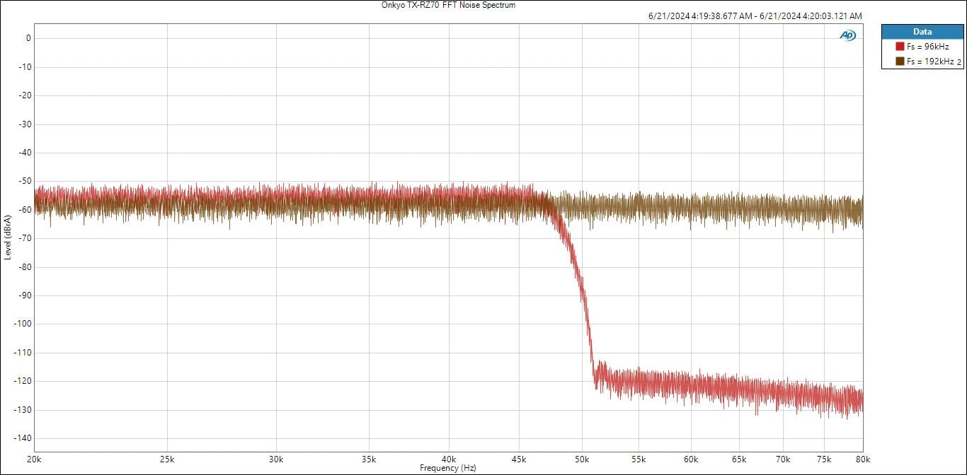 Onkyo TX-RZ70 FFT Noise Spectrum - fs = 96kHz (red) & 192kHz (brown)