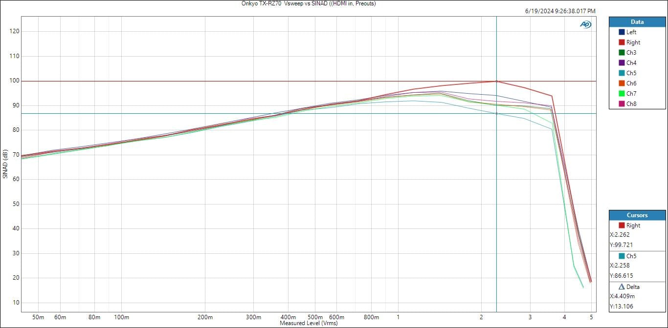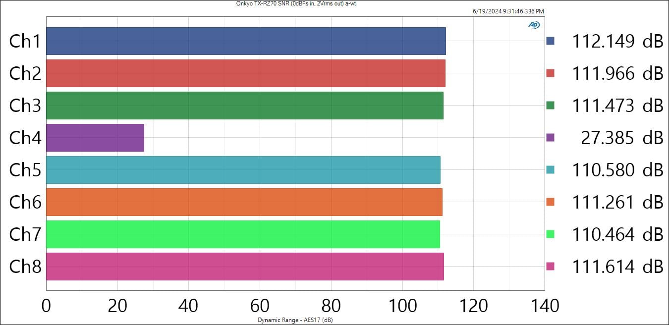 The Signal to Noise Ratio from the analog preouts of the Onkyo TX-RZ70 is excellent. With a 0dBFs input and 2Vrms output, I measured about 112 dB for ALL the channels regardless if I engaged preamp mode, pure direct or regular multi-ch. Anything above 100dB at 2Vrms is considered “quiet” in my book. The Onkyo is dead silent and will make for an excellent preamp/processor if you decide to power up in the future with a multi-channel amplifier.