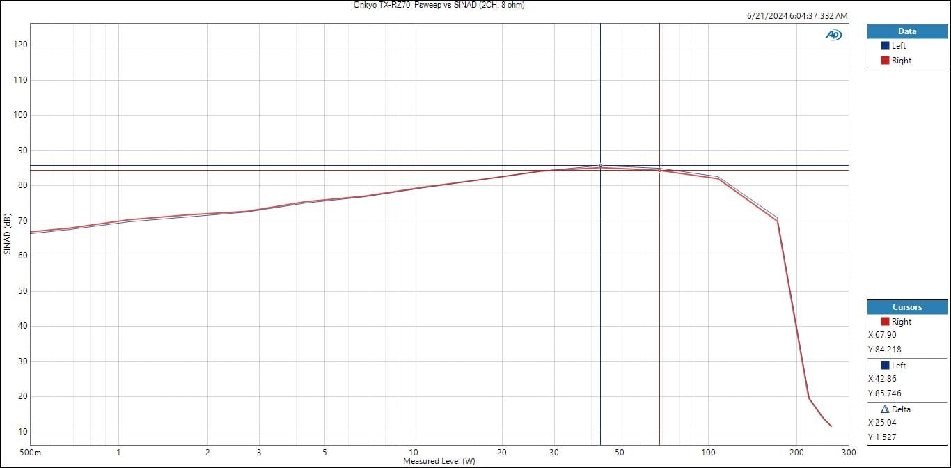 Onkyo TX-RZ70 SINAD vs Power (2CH) – 8 ohms
