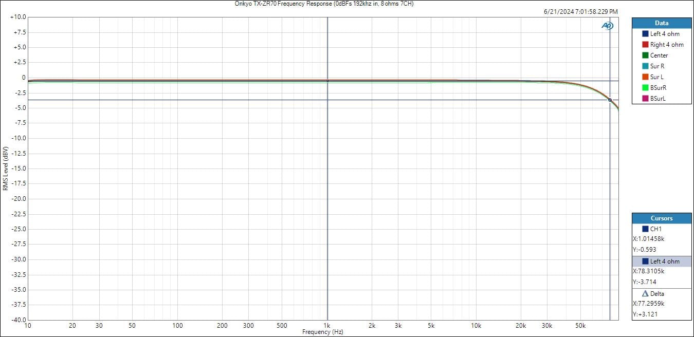 The TX-RZ70 exhibited ruler flat frequency response from the power amp all the way out to 48kHz with a -3dB pt of 78kHz. With two-channels driven, the 140 watt/ch rated TX-RZ70 delivered almost 170 watts/ch for full bandwidth 20Hz to 20kHz at under 1% THD+N into 8 ohm load. Under similar test conditions for 4 ohms, the TX-RZ70 delivered 265 watts/ch 2CH driven at 0.05% THD+N. I couldn’t test it at a higher level without tripping the protection circuits.