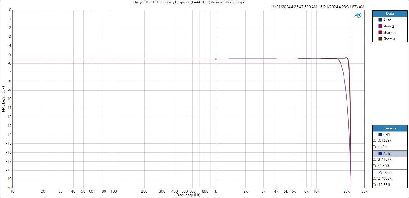 Onkyo TX-RZ70 Frequency Response of Various Filter Settings (Fs= 44.1kHz)