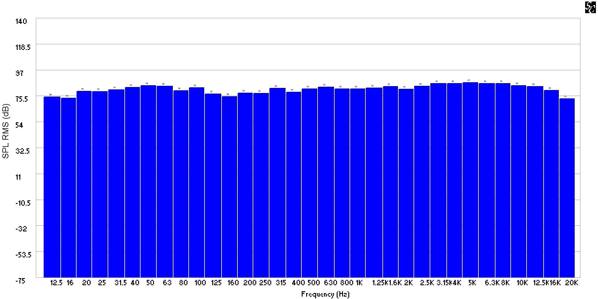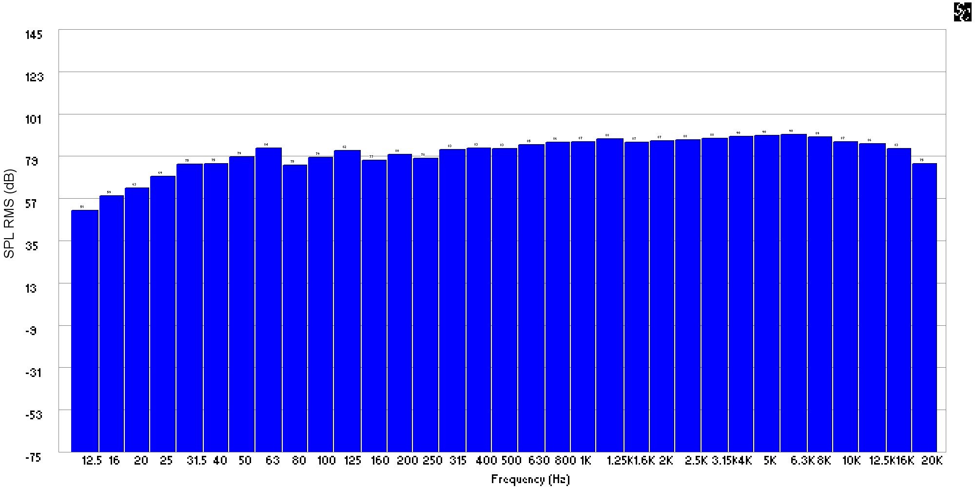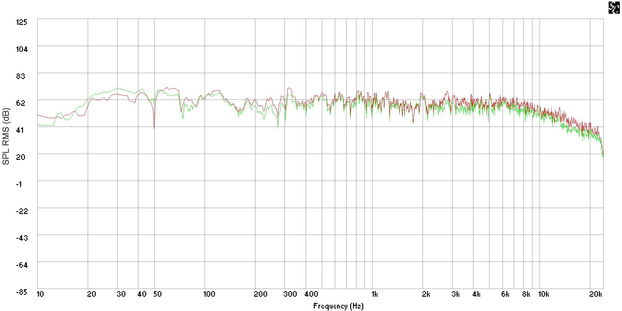 Test measurements were then performed at the primary and secondary listening positions for both the left and right main channels at an SPL of 80dB at each listening position. The primary listening position is located approximately centered on the front L/C/R channels and at the approximate center of all calibration settings for time delay. The secondary measurement position is located to the left and forward of the primary position near the room boundary.