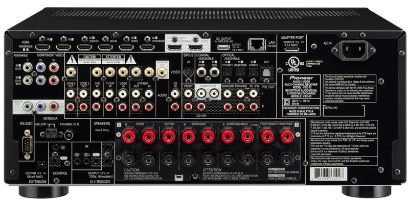 The VSX-53 has seven 3D ready HDMI version 1.4a inputs (one front-mounted) and two outputs that support Audio Return Channel. It has two component video and three optical and two coaxial digital audio inputs. There are nine sets of speaker terminals for accommodating not only the seven channels of amplification (at 110 watts per channel) but also multiple configurations. Zone 2 has pre-outs as well as a composite video output. Zone 3 is supported, but audio only. The VSX-53 has pre-outs for 7.2 channels (the specs say 7.1 but we see two subwoofers outputs on the back) plus an extra set for integration of front height/width channels (for Dolby ProLogic IIz and Pioneer's own proprietary processing).