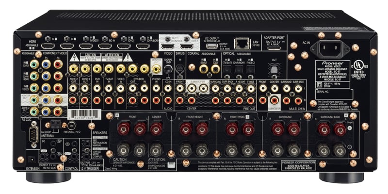 Pioneer claims 140 W x 9 (1 kHz, THD 0.08% @ 8 ohms FTC) or 810 Watts Multi Channel Simultaneous Drive Capability (8ohms, 1Hz,THD, 1%). The 1kHz measurement isn't the most rigorous and we usually see that in lower-end receivers that use it to pad their numbers to impress customers. We're definitely interested to see what this new amplifier design can do on our test bench. While THX Ultra2+ certification didn't help the SC-07 on our tests, we're betting the SC-57 does a lot better.