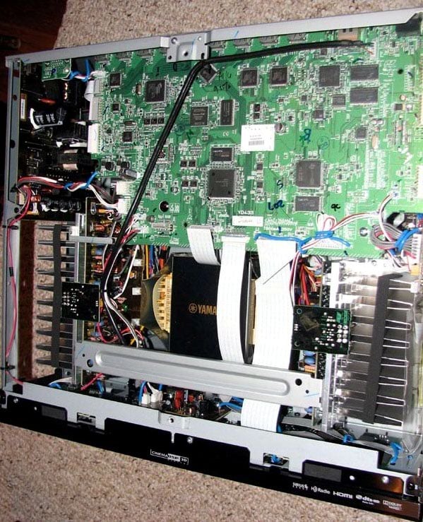 Unlike prior Yamaha receivers at this price point, which utilizing a single heatsink for their power devices, the RX-A1010 splits this duty off to smaller dual heatsinks mounted on each side of the power transformer in what Yamaha calls a "dual symmetric power amplifier layout". At first glance, these heatsinks appear small but more careful observation reveals extra thick metal plating at the base of the heatsink mounted to a very thick bottom cover to help dissipate heat and increase chassis rigidity. Yamaha also employed brand new thermal control regulated power transistors in this baby to better manage heat.