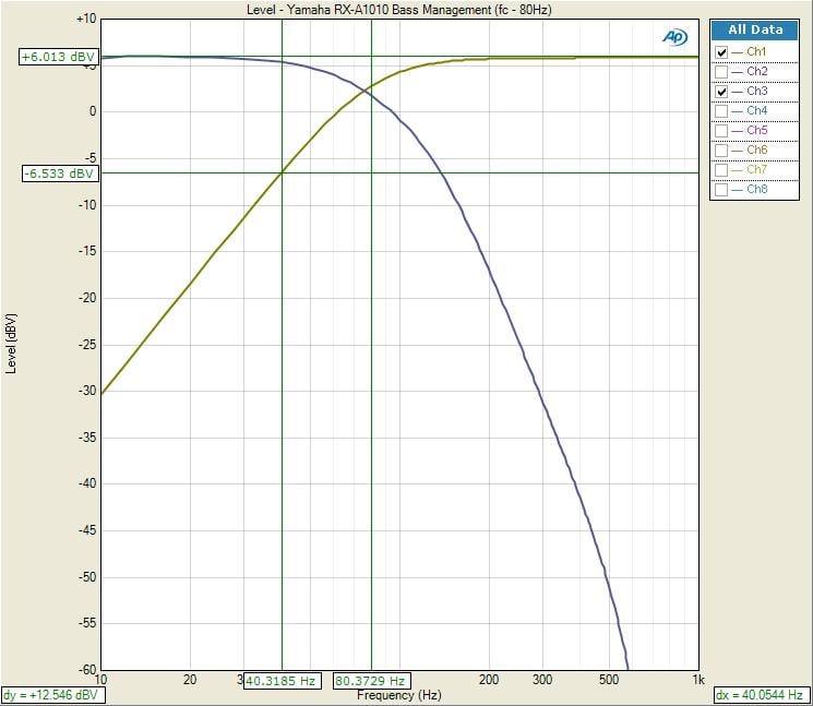 Using our Audio Precision APx585 8-channel HDMI Audio Analyzer, we confirmed if you set the main channels to “small” and all other channels to” large”, and set the Xover to 80Hz, the LPF -3dB pt is actually 94Hz with a 20dB/Oct rolloff. Only when you set ALL speakers to “small” do you actually get closer to the intended crossover frequency. However, the slope of the LPF is a bit shallow as it should instead be 24dB/Oct like we’ve seen on Yamaha predecessors. The HPF function worked as expected, with the correct -3dB point and 12dB/Oct slope. In practice this likely won’t cause any audible issues but it’s probably a good idea to set all speakers to “small” or only the main channels to “large” to get the most accurate intended bass management response.