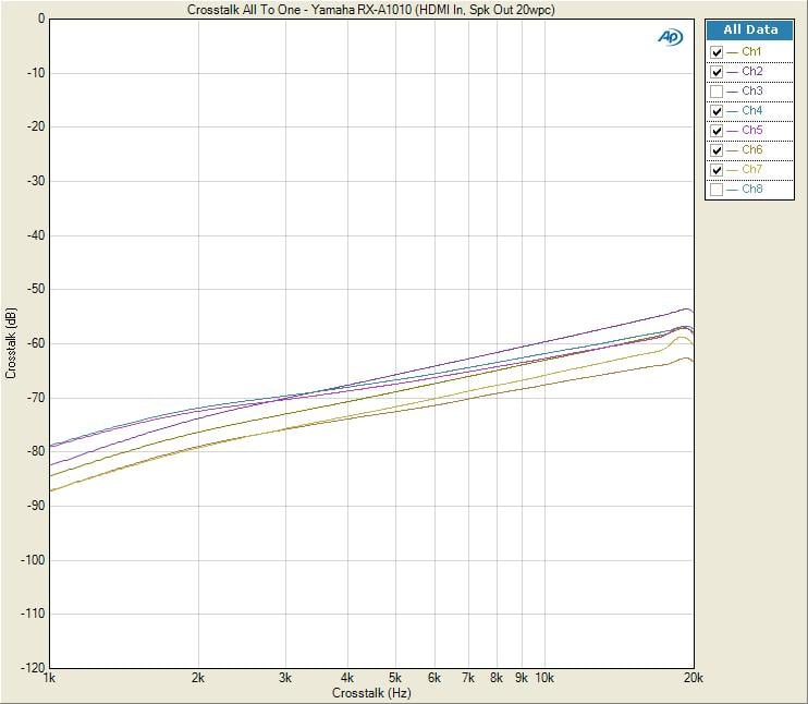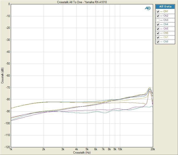 I measured all-to-one crosstalk from the preamp input of the RX-A1010 all the way to the speaker outputs with each channel driven at 20 watts (except the channel under test). Channel to channel crosstalk was excellent (80dB @ 1kHz, 55dB @10kHz). Again this is a worst case crosstalk measurement. Simply measuring channel to channel crosstalk with only one channel acting as a disturber produced much better numbers (95dB @ 1kHz and 70dB a@ 10kHz). This is how most publications measure crosstalk but we tend to be harder on the products and test them in the worst case scenarios like these.