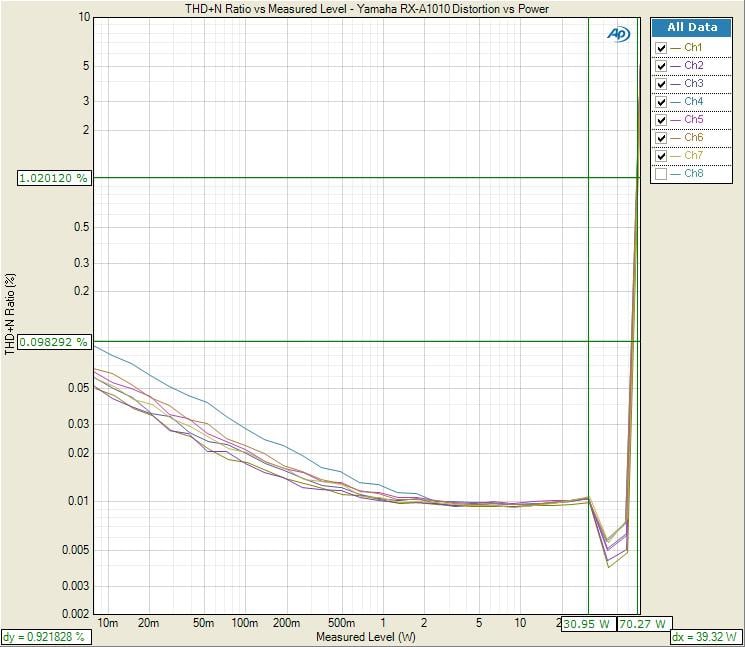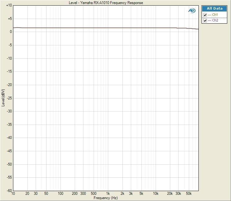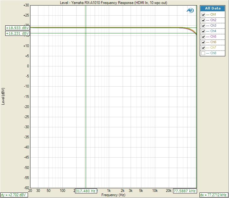 With the RX-A1010 driven by a -20dBFS input signal via HDMI, I measured all channels driven at 8-ohms via the speaker outputs at 10 watts power level. Frequency response was again ruler flat from 10Hz to 50Khz, with a -3dB point at around 80kHz. Channel to channel variance was +-0.02dB variance which was incredibly tight.
