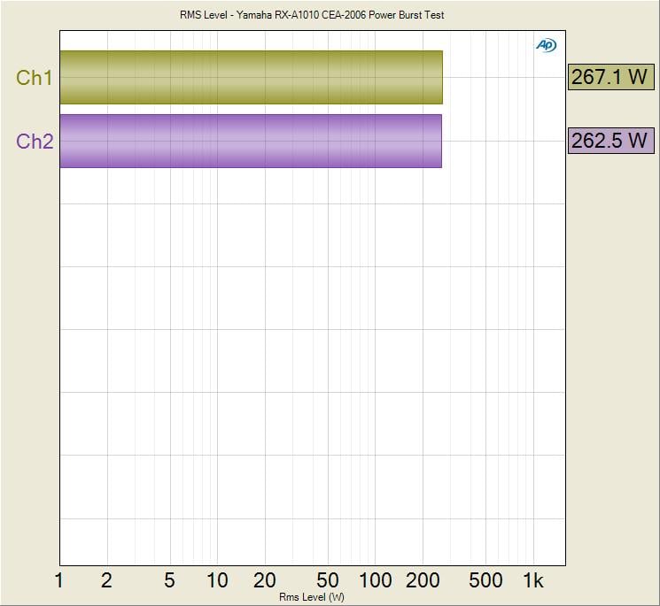 The RX-A1010 delivered impressive dynamic power results under all loading conditions. Into 8-ohms, 1 channel driven, the RX-A1010 produced 170wpc or about 1.9dB of headroom over its 110wpc rating. Interestingly the RX-A1010 delivered similar results into 1 or 2 channels driven into 4-ohm loads producing in excess of 260wpc. Yamaha specs the RX-A1010 as being able to deliver 210wpc dynamically into a 4-ohm load. I would say that is rather conservative given my measurement results using the CEA 2006 burst test.