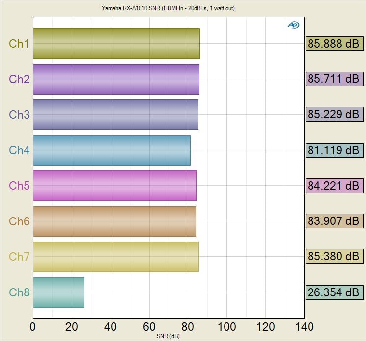 Driving the RX-A1010 with a -20dBFS input signal via HDMI, I measured 81dB to 85dB SNR at 1 watt with all channels driven. The RX-A1010 noise floor from preamp all the way through its power amp section is commendably low. I measure amplifier SNR at 1 watt to put everyone on equal footing and to also better gauge its low level performance where the amplifier spends most of its time operating at. I consider 80dB @ 1 watt (un-weighted) to be a good measurement which the RX-A1010 comfortably exceeded.