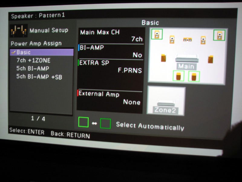 Yamaha makes this really simple by illustrating all of the possible assignable amplifier options in clear diagrams via their GUI interface. The user is offered a basic 5.1 configuration, 7CH + Zone2 which they oddly label as 1Zone, 5CH Bi-amp and 5CH Bi-Amp + SB which allows you to use external amplification for the surround back channels while still bi-amping the front channels.