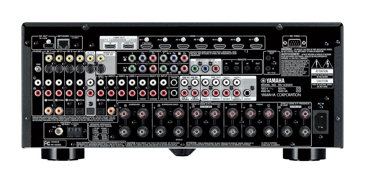 The back of the RX-A2020 reveals eleven pairs of speaker terminals for easy configuration switching. Yamaha's presence speakers can be powered with the extra amps or users can select a 5.2 system for the main room with both Zones 2 and 3 receiving power from the internal amps. RCA pre-outs are available fro both Zones and Zone 2 can receive video from either HDMI (same as what is in the main room) or separate video from the component, composite, or s-video outputs.