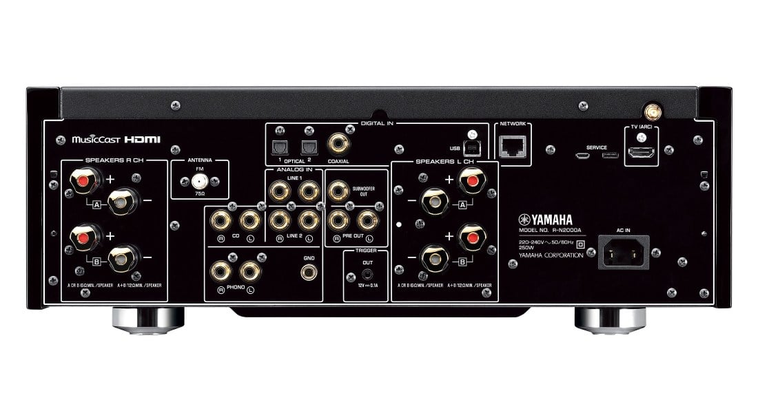The built-in DACs in many stereo products — even some expensive ones — are often just there for convenience. If you’re serious about sound quality, you’ll get a separate DAC. But Yamaha says that’s not the case with the R-N2000A, which has a DAC section built around the state-of-the-art ES9026PRO digital-to-analog converter from ESS Technologies. This high-performance chip reportedly achieves highly accurate signal conversion and refined current delivery thanks to its four-channel operation and balanced analog audio output. The result is a digital section that reproduces “even the subtle ambience of concert halls and delicate expressive nuances,” while serving up “clear, transparent sound field reproduction (with) rich and fully detailed audio.” Users can take advantage of this DAC in a number of ways. There are, of course, optical and coaxial inputs for connecting a CD transport, Bluesound Node, or Roon endpoint like the WiiM Mini streamer. There’s also a USB input allowing the R-N2000A to connect to a PC or Mac, or to a USB-based audio device such as iFi Audio’s affordable Zen Stream ($399) or the high-end music servers available from companies like Innuos, Aurender, and Auralic. The USB input supports PCM playback up to 384kHz, and DSD 11.2MHz native playback as well. This input also benefits from an ultra-precision dedicated crystal clock designed to improve signal accuracy, allowing you to take full advantage of high-res audio sources. Finally, there’s an HDMI ARC (Audio Return Channel) input, allowing the R-N2000A to connect directly to a compatible TV to deliver a powerful 2-channel or 2.1-channel home theater experience. In addition to accommodating these digital sources, the built-in DAC can be used to enjoy a suite of Yamaha MusicCast streaming services – including Amazon Music HD, Apple Music (via AirPlay 2), Spotify, Tidal, Qobuz, and many others — via Wi-Fi or ethernet.